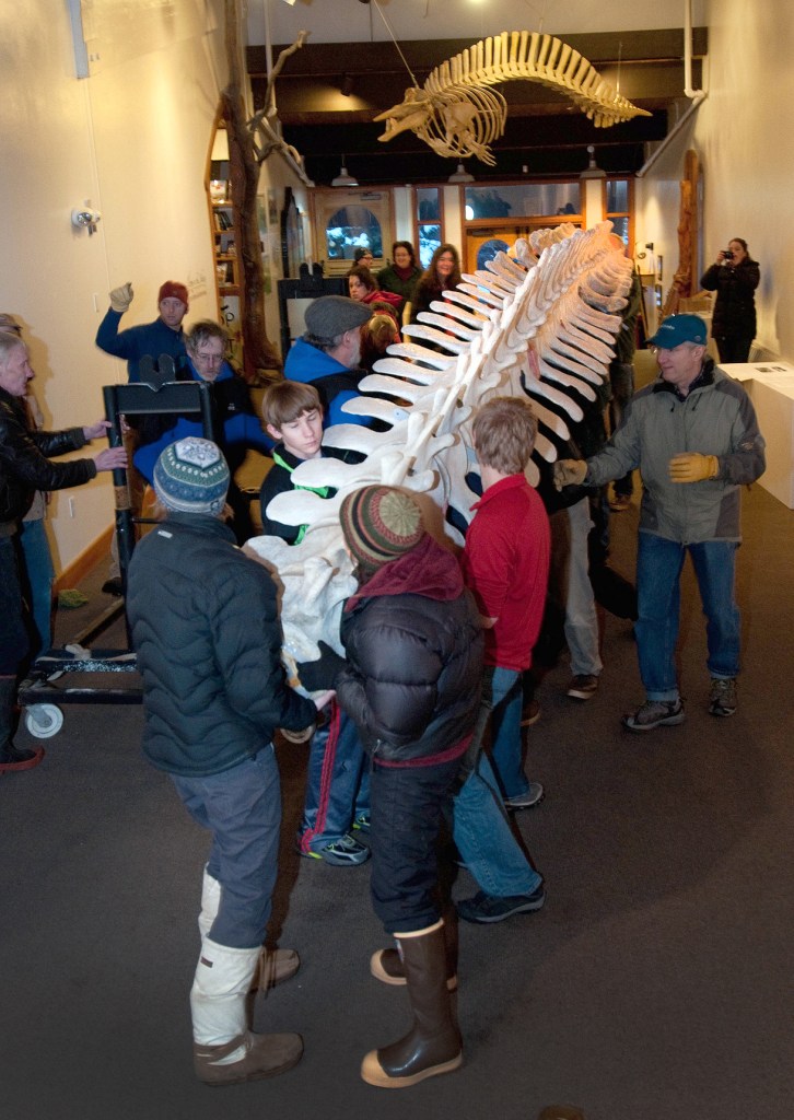 Saturday was moving day at the Pratt Museum when about 25 volunteers showed up to help move sections of a gray whale from the workshop into the space where the new exhibit, “Encounters: Whales In Our Waters,” will open on Feb. 1. The exhibit will profile nine cetacean species with the centerpiece this gray whale that washed ashore near Halibut Cove in 1999.