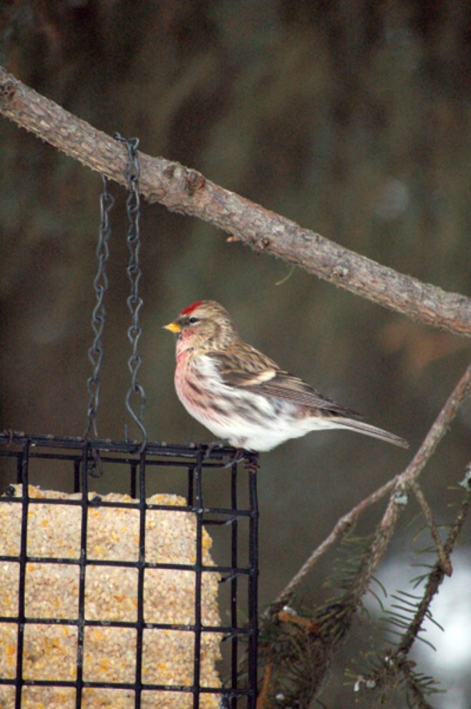A common redpoll feeds at a suet block.-Photos by Michael Armstrong, Homer News