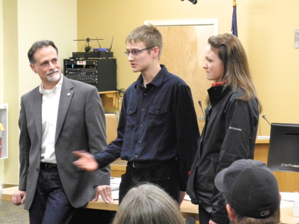 Kody Knox, center, speaks about a recent trip to the Alaska Legislature and Juneau as District O Sen. Peter Micciche, R-Soldotna, listens at a town hall meeting last Friday at the Cowles Council Chambers, Homer City Hall. Knox and his sister, Esther, right, are homeschool students from Ninilchik who recently studied the issue of methamphetamine and drug abuse. As a project, they went to Juneau to lobby for more funding for behavioral health services, specifically Serenity House, a substance abuse center in Soldotna.