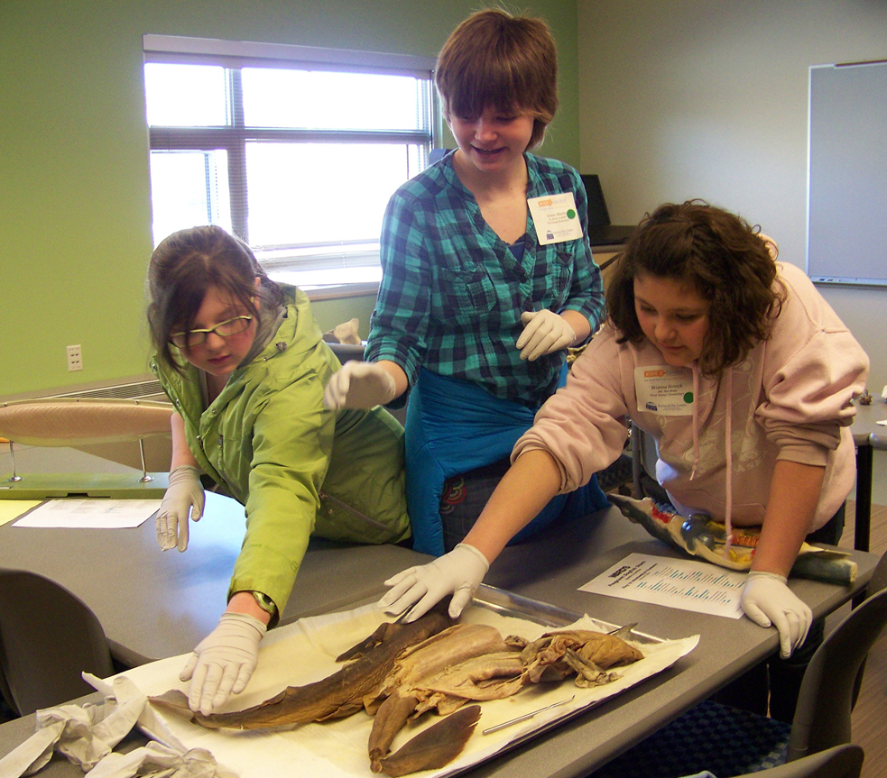 Explanations from biology professor Debbie Boege-Tobin of Kachemak Bay Campus, Kenai Peninsula College-University of Alaska Anchorage, directed students’ attention from one specimen to the next last Friday. Some asked questions. Some blocked their noses against the fishy smell filling the room. When Boege-Tobin gave the OK, the students donned gloves and gave the specimens a closer inspection.