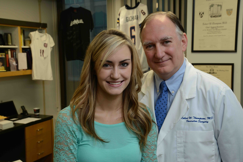 A few days later she went to Belleville Memorial Hospital, where doctors tried to remove the clot and open up the vein with a catheter snaked up inside her vein. That didn’t work and she then went to see Dr. Thompson at the Washington University Center at Barnes-Jewish Hospital, St. Louis.