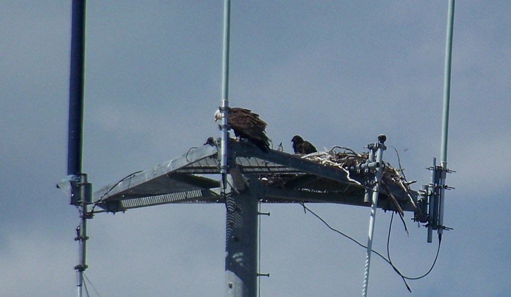Turning around, we raised our eyes to the top of a tall cell tower and the eagle nest on a triangle-shaped platform. After minutes of patient viewing, the white-headed silhouette of an adult eagle came into view, followed by the smaller, dark silhouette of its young.