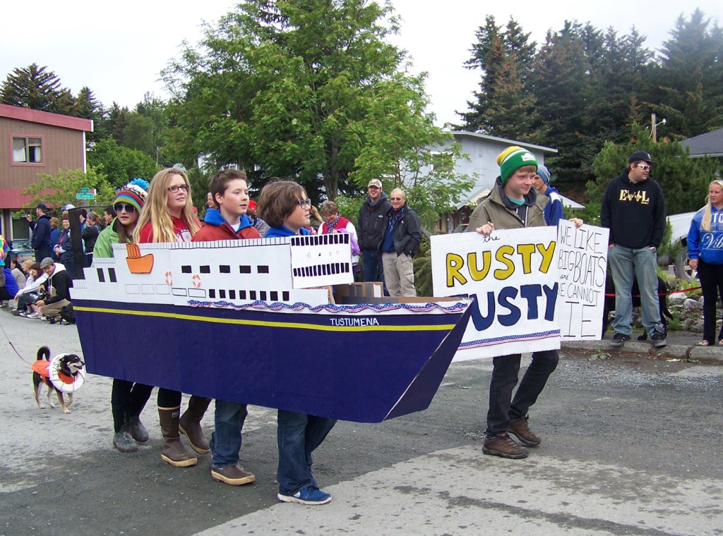 A Fourth of July parade float makes clear Seldovia’s strong connection to the M/V Tustumena.-Photo by McKibben Jackinsky, Homer News