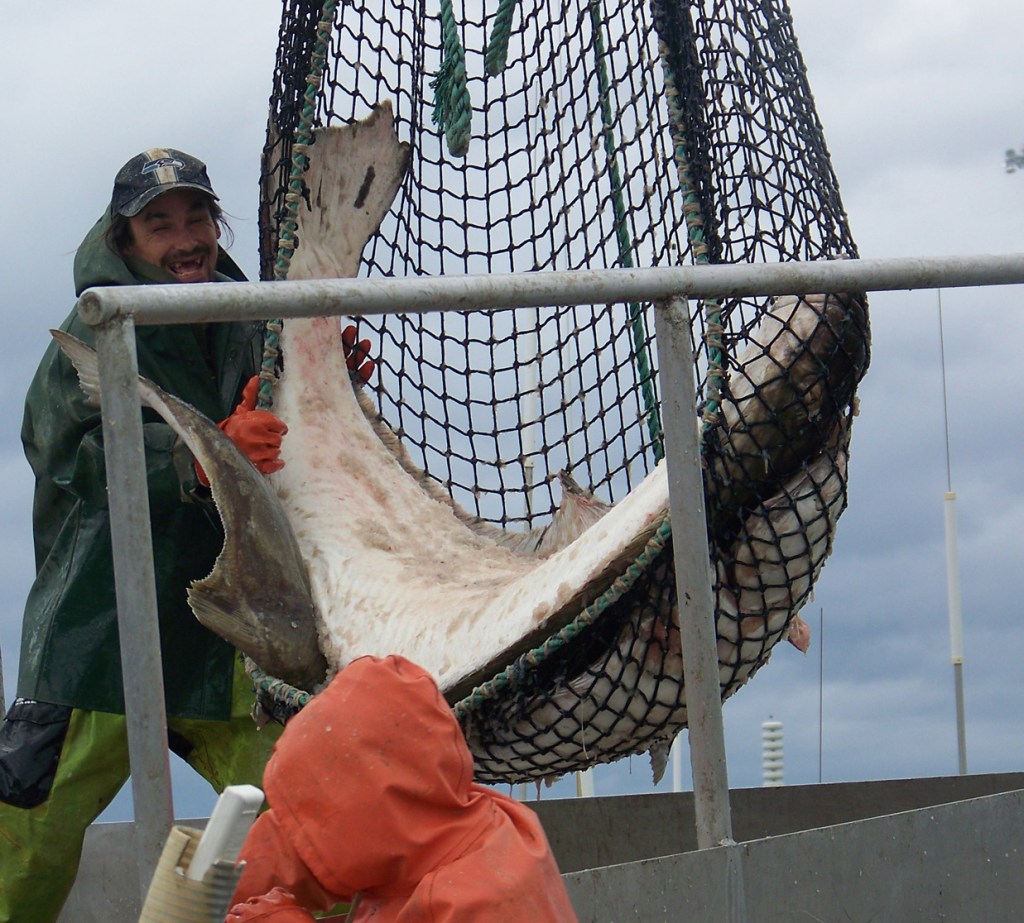 Icicle Seafoods crew on Tuesday unload an 88-inch halibut from the Dangerous Cape, a commercial halibut-fishing boat owned by Eric Velsko, John Velsko and Nick Downs. The boat’s catch also included a 91-inch flatfish. According to a halibut length-weight chart created by the International Pacific Halibut Commission, the weight of an 88-inch halibut is about 376.5 pounds before being cleaned and a 91-inch halibut will be around 419.7 pounds.