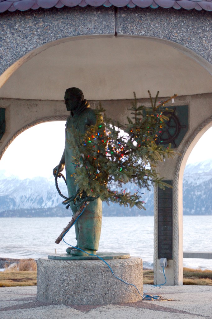 The Seafarers’ Memorial statute holds a lit Christmas tree last week. Many boats in the harbor had Christmas trees as a memorial to the late Bob Moss. The Hungry Hat Gypsy Family Circus holds a bonfire and Christmas tree burn at 11 p.m. Saturday at Bishop’s Beach after its show at 6 p.m. and an open fire jam from 8-9:30 p.m.