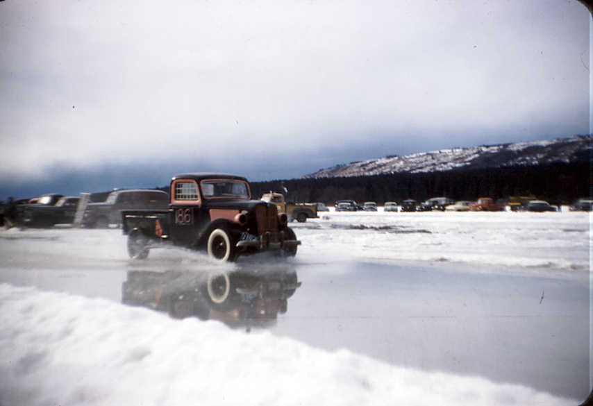 Early in 1955, Jones passed around a flyer that said in effect, “hey, let’s do some ice racing on the lake and meet at Ora’s shop.” Jones had an auto repair shop, Husky’s Repair, where Coastal Realty now sits at the corner of Pioneer Avenue and the Sterling Highway. Jones and Orville Waddell did some body work on a 1940s Plymouth four-door sedan Jones planned to race.