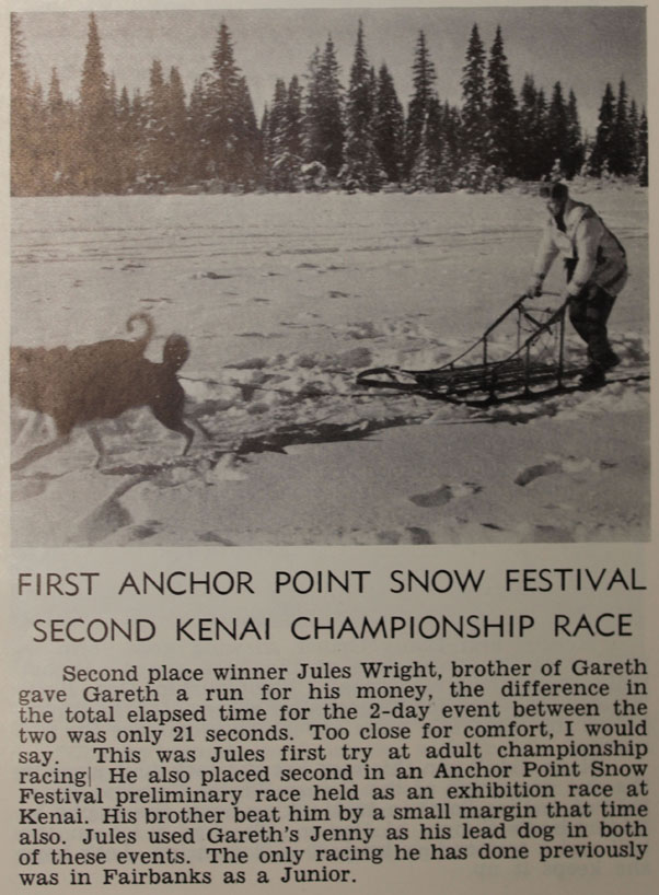 “Organized racing for Anchor River teams started in 1957 at the Homer Winter Carnival with Bill Brody, Lefty Howard, Inez Clendenen, Darrel Koch and Larry Clendenen putting on the first race, racing again at Homer in 1958,” said an article in the 1962 program. “Interest had become so intense that the local mushers organized the Anchor River Sled Dog and Racing Association.”