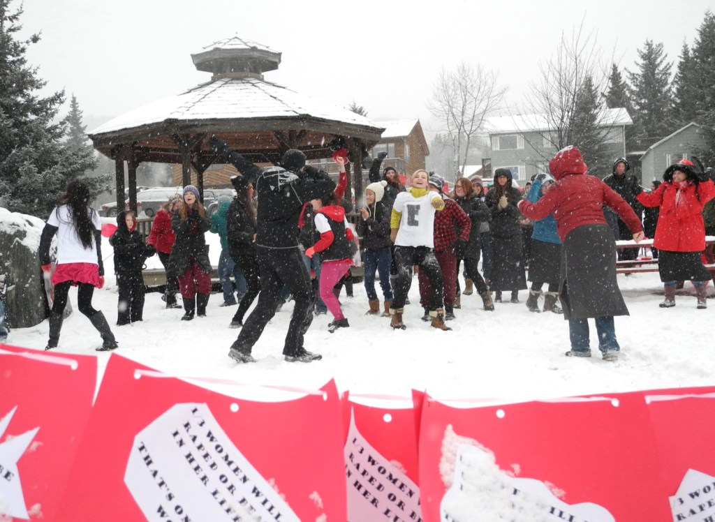 Participants in Homer Rising, the local version of One Billion Rising, dance at the end of the event last Friday at WKFL Park. People shared poems and honored female survivors of sexual violence. The United Nations estimates one in three women in their lifetime will be victims of sexual violence.