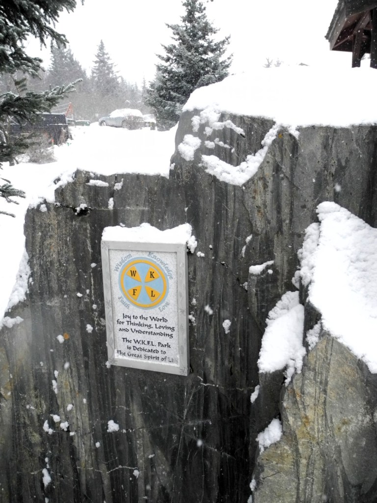 Fresh snow covers the rock at WKFL Park on Valentine's Day. John Nazarian proposed donating a bronze statue of Brother Asaiah Bates to go on this rock. A plaque on the rock explains the meaning of WKFL — "Wisdom, Knowledge, Faith and Love."-Photo by Michael Armstrong, Homer News