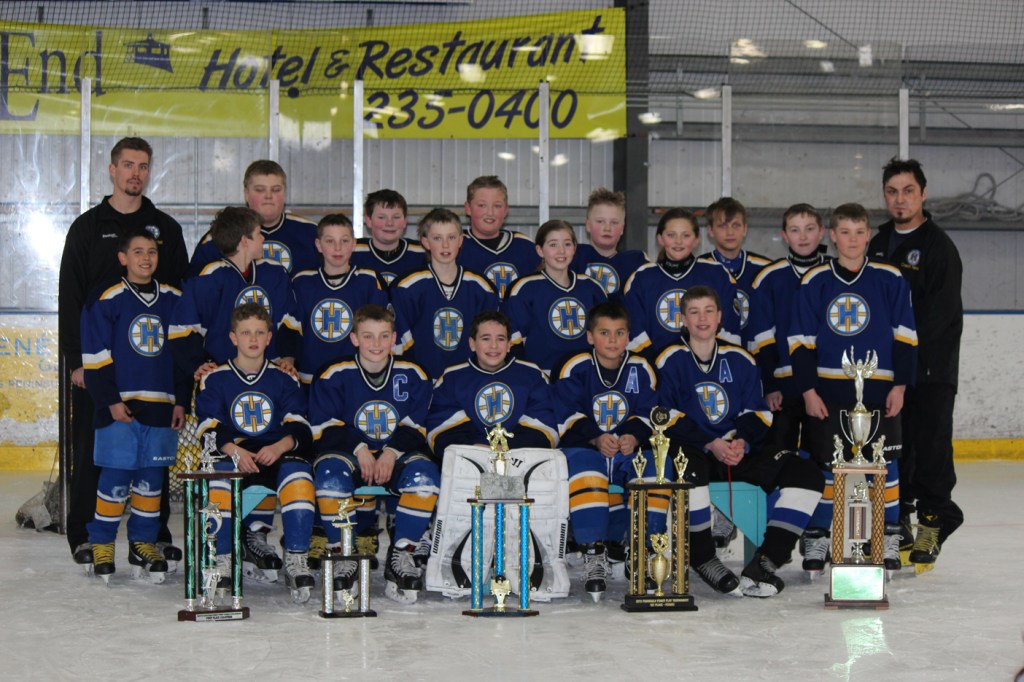The Homer Pee Wee Hockey team spent the 2013-2014 season proving the meaning of the team’s motto: 111 percent 100 percent of the time because 110 percent is not enough. The team — front row from left: Lee Lowe, Ethan Pitzman, Hunter Warren, Isaiah Nevak, Tucker Weston; middle row left to right: Karl Wickstrom, Liam Colman, J.J. Williamson, Tyler Gililand, Claire Bryant, Kaitlyn Johnson, Nicholas Reutov, Phinny Weston; back row left to right: Assstant Coach Chance Rockett, Finn Heimbold, Conner Roderick, Colby Marion, Tommy Bridgeman, Zasima Martushev, Head Coach Steve Nevak — not only finished the season with a 46-0 record, they also earned an impressive collection of trophies. The 11- and 12-year-olds’ hard work secured them the titles of 2013 Peninsula Powerplay champions, 2013 Big Lake Tourney Champions, 2014 MooseFest Champions, 2013 Presidents Day Champions and the 2013-2014 Pee Wee Tier III State Champions.