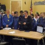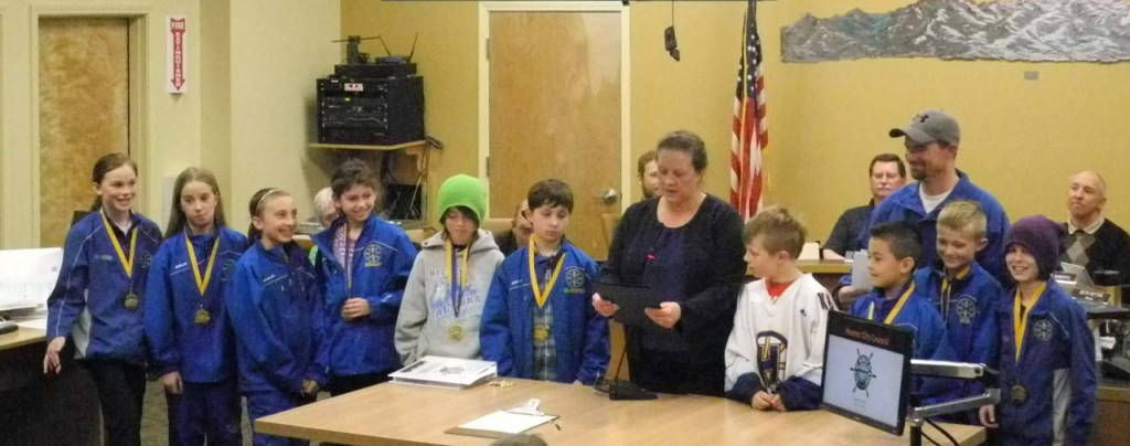 Homer Mayor Beth Wythe reads a proclamation honoring the Homer Glacier Kings Squirts hockey team state champions at the Homer City Council meeting on Monday. Honored were team members, in no order, Rachel Bolin, Terry Gilliland, Hunter Green, Delilah Harris, Timothy Hatfield, Fiona Hatton, Dylan McBride, Tobias “Jack” Nevak, Casey Otis, Haylee Owen, Kazden Stineff, Keegan Strong, Micah Williamson, head coach Chris Owen and assistant coaches Dave Bolin and Travis Larson. -Michael Armstrong-Homer News