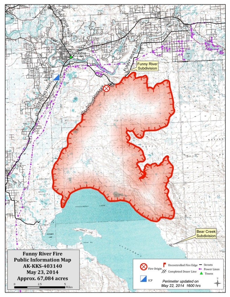 Click on “fire information” in menu to the left to get a map of all fires in Alaska. Zoom in to see the Funny River fire.