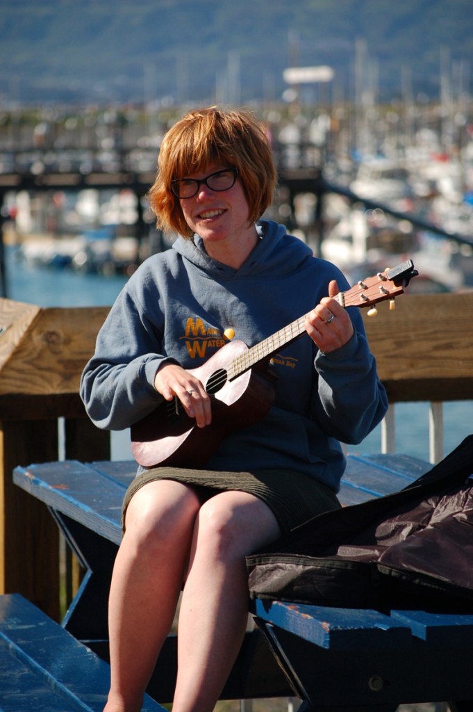 Maria Fourier sings and plays the ukulele on the Homer Harbor boardwalk last Thursday afternoon.