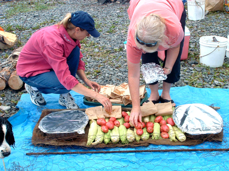 While they learned to sail, the Boileys taught locals about clambakes. Club members and guests sailed to the designated beach on the south side of Kachemak Bay, clams were harvested and a pit dug in which a fire was built on top of rocks. Once the rocks were heated, live coals and burning wood were removed, the rocks were leveled and a covering of seaweed added. Over that went a wire mesh basket containing clams, mussels, ears of corn, potatoes, and brown bags each containing a slice of salmon, halibut, onion, lemon and piece of Italian sausage. A canvas tarp came next, covered by another layer of seaweed and a double layer of canvas tarp, over which water was periodically poured. Two hours later, the steaming basket was lifted from the pit and the feasting began.