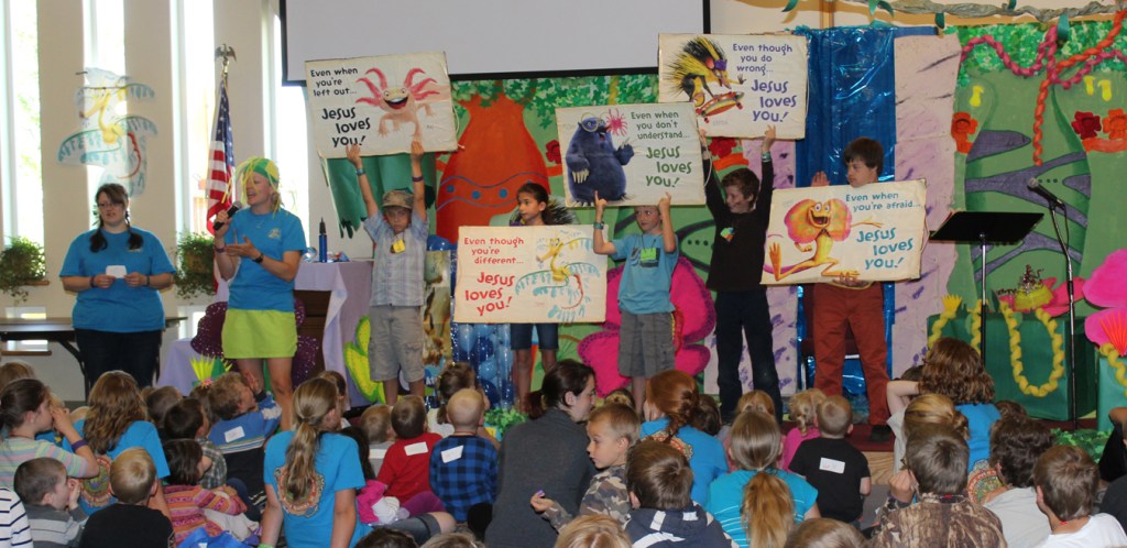 With half the enrollees of preschool age, it’s easy to imagine the level of energy that permeated Faith Lutheran throughout the week, especially given the theme — “Weird Animals Vacation Bible School: where kids learn that Jesus’ love is one-of-a-kind.” Toss in large pictures of weird animals, bigger-than-life cutouts of flowers, make-believe vines strung overhead; add scripture readings, music and games and it’s a formula for a memorable time.