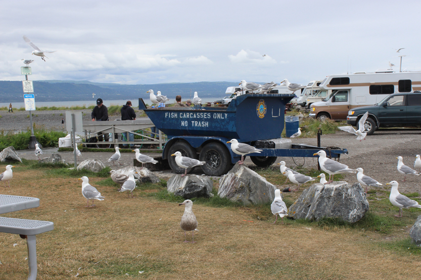 Then there are the gulls. Lining the roof of the nearby restrooms. Standing on parked cars. Crowding around the rim of the trailer where fishermen discard fish carcasses.