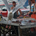 Next to Schneider, Joel Sewell cut his fresh-caught salmon into chunks. Formerly from Anchorage and now a resident of Alberta, Canada, Sewell said not having a fishing buddy with him at the cleaning table means he can’t turn his back on his task for fear a gull will make off with what he worked so hard to take home.