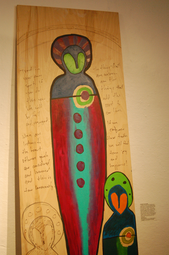 Several of his masks beg to be handled, like a large mask that stands almost 3-feet tall on a stand. He made a similar series of 10 masks for a collaboration with artist Liz Ellis, “Aggravated Organisms.” Michael carved and Ellis painted masks showing types of diseases that affect Alaska Natives, like diabetes, alcoholism and suicide.