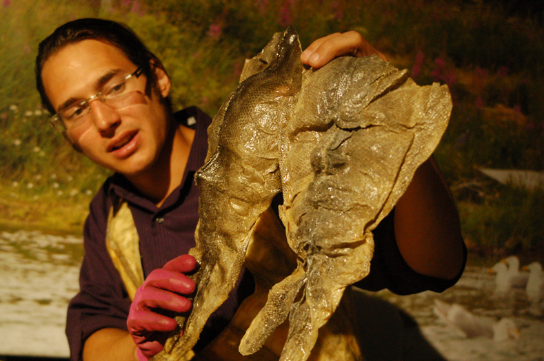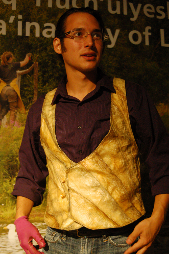 During his three-day residency from last Saturday to Monday, he worked behind a table piled with salmon skins. Isaak also wore a salmon skin vest with halibut vertebrae buttons. Salmon skin sewing as art and tradition has made a comeback, Isaak said. Isaak is largely self-taught. He read everything he could about treating and curing skin. Later, he learned from sewer Helen Dick, from Point Possession on the north Kenai Peninsula.