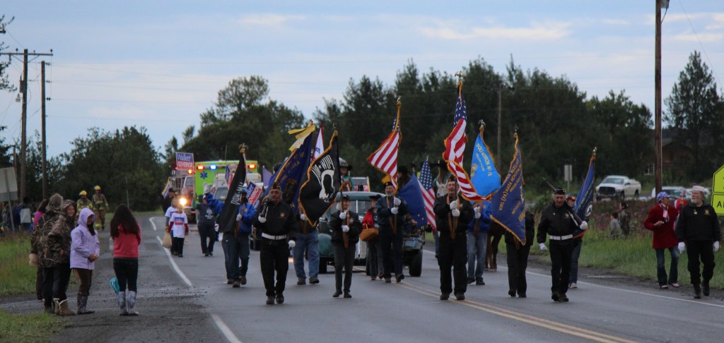 A color guard from Veterans of Foreign Wars Post 10221 in Anchor Point leads the Kenai Peninsula Fair parade Saturday morning in Ninilchik.-Photo by McKibben Jackinsky; Homer News