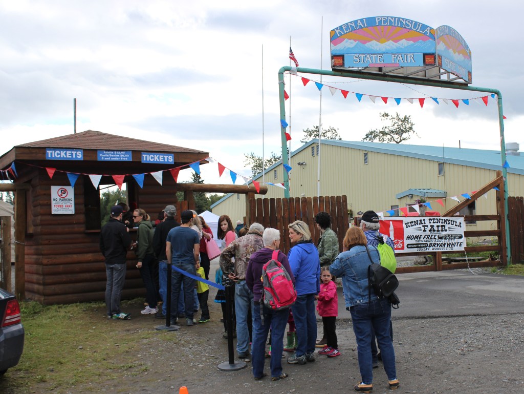 In spite of Saturday morning's rain, visitors lined up at the gate of the Kenai Peninsula Fair. -Photo by McKibben Jackinsky
