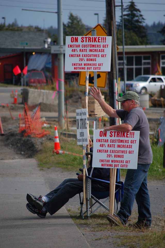 Striking Enstar Natural Gas worker Wally Jacks waves at cars as fellow striker Geoff Decter sits in a chair behind him on Aug. 14. Members of the United Association of Plumbers and Steamfitters Union Local 367, the strikers set up a picket line in front of the Enstar offices on the Sterling Highway. Local 367 business manager Greg Walker, Anchorage, said he could not comment on the strike.