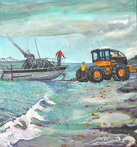 Homer artist Marjorie Scholl recently painted a mural on the wall of Fat Olives. Her work returns with “Heavy Metal,” paintings of ships, trucks, helicopters and other big machines. The idea came to her 15 years ago after she arrived in Homer. Scholl grew up in a suburban dairy town in the San Francisco Bay Area.