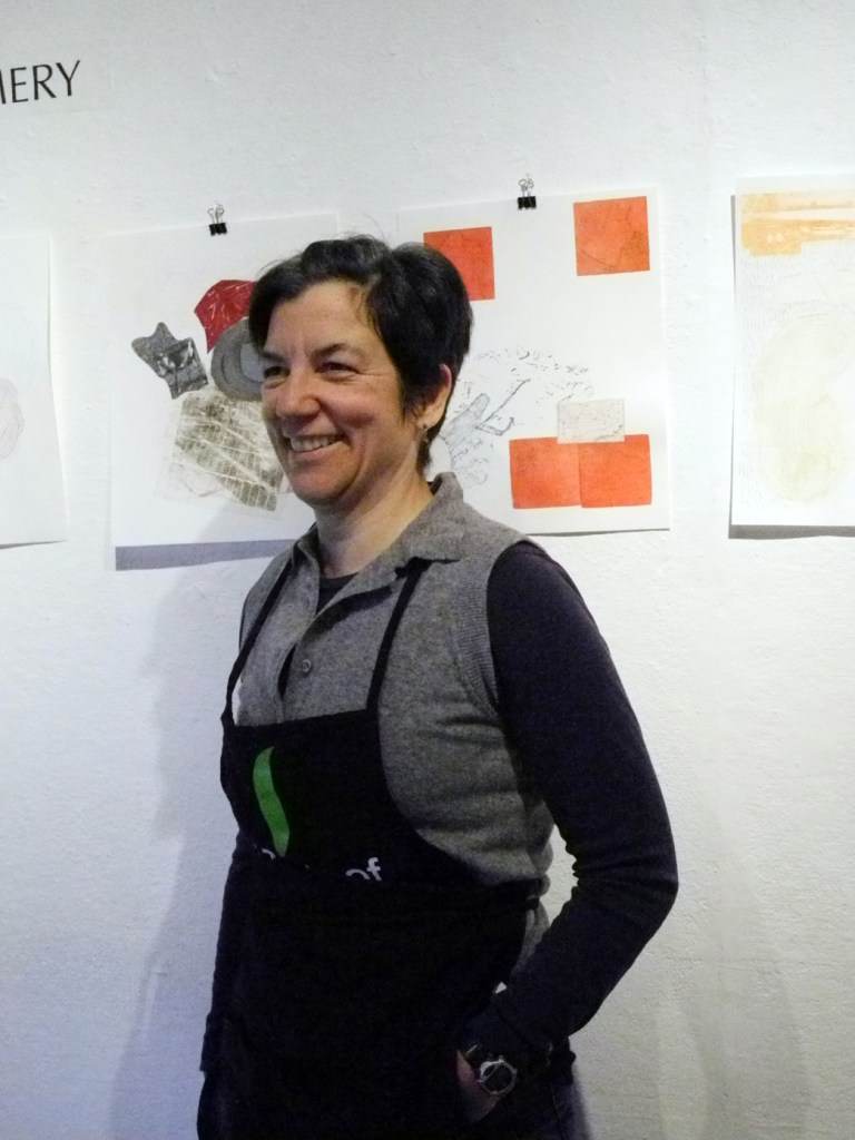 A sculptor as well as a printmaker, Emery said she’s using the residency to focus on printmaking as an art. In her sculpture she makes fabric forms out of thrift shop clothes and then fills it with concrete.