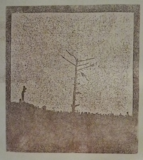 Some images Emery does by hand directly into the plate, while others she makes from Photoshop-manipulated photographs. One image is a view out her B&B window showing the tops of motorhomes in the Driftwood RV Park against the Kenai Mountains and Kachemak Bay. Emery doesn’t curse fall’s gray skies, since gray in photographs works better in making plates.