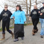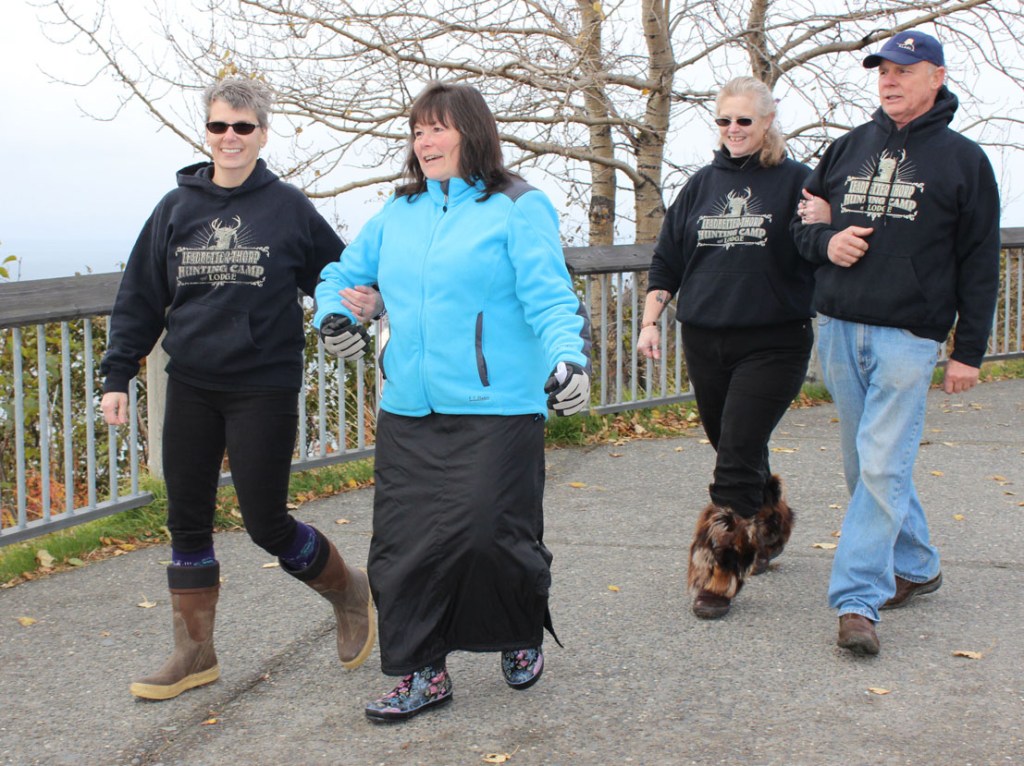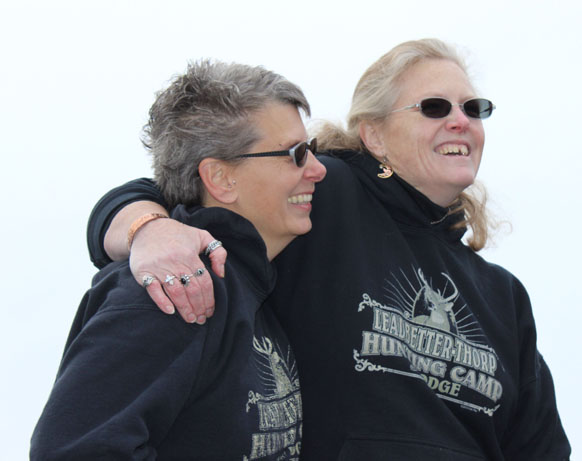Dawn Thorp and Stephanie Nicholls were married Tuesday afternoon in a ceremony at the top of Baycrest Hill. They are the second Homer couple to file for a wedding license since the ban on same-sex marriage was lifted in Alaska earlier this month. Before moving to Alaska in 2012, they celebrated a “commitment ceremony” in Montana. Above, Nicholls is walked down the “aisle” overlooking Kachemak Bay by Deb Rhoades, while Thorp is accompanied by her uncle, George Remington. The couple was married by Dave Eckwert. With friends and family bundled up against chilly temperatures, the wedding couple wore matching hooded sweatshirts bearing their new last name: Leadbetter-Thorp, a combination of their maiden names. The ceremony ended with cheers and applause, and with Mary Jane Shows performing an a cappella arrangement of, “Let’s Do It, Let’s Fall in Love.”