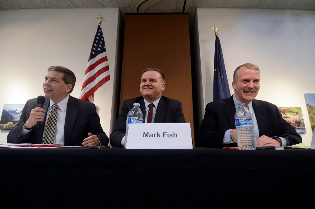 Democratic incumbent Sen. Mark Begich, D-Alaska, Libertarian Mark Fish and Republican Dan Sullivan answered a series of questions during a forum hosted by the Kenai and Soldotna chambers of commerce on Tuesday in Kenai.-Photo by Rashah McChesney, Morris News Service - Alaska