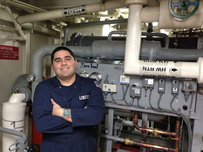 Correa has been stationed aboard the Hickory for three years and is due to transfer to another Coast Guard unit next summer. He is a member of the Hickory’s auxiliary machinery division and specializes in air conditioning and refrigeration systems. His insights led to the recent discovery of a problem with the ship’s auxiliary salt water system, a problem that reduced performance of the Hickory’s refrigeration system and endangered other essential shipboard systems, according to Parker. In addition to solving the problem, Correa shared his solution with the Coast Guard’s 15-vessel sea-going buoy tender fleet.