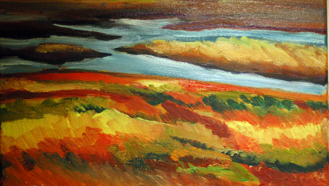 That students embraced the autumn landscape can be seen by the dominance of an orange, yellow and red palette, like Oceana Wills’ “Slough Grass.” Some artists followed a different drummer, though, like Carol Beverly.