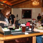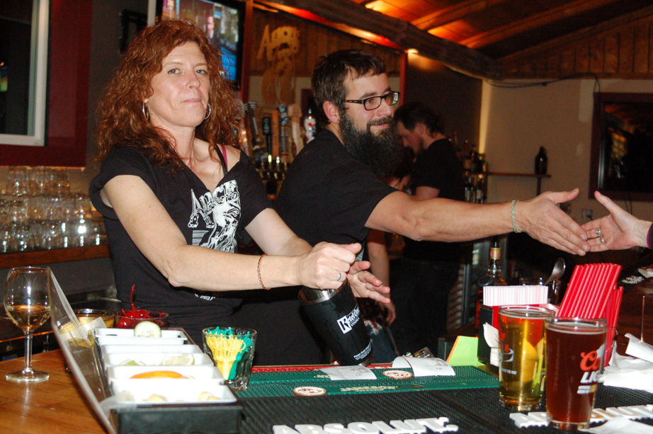 Kat Clarke, left, mixes a drink while Sunrose Olson, right, waits at the reopening last Friday of Alice’s Champagne Palace. -Photo by Michael Armstrong, Homer News
