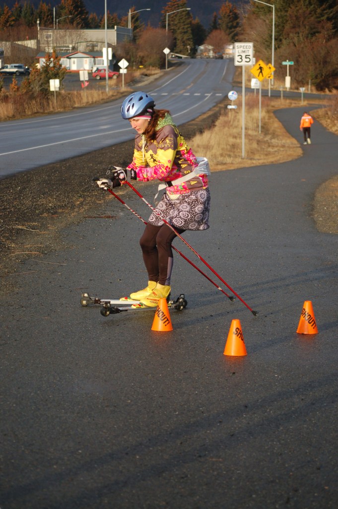 Annie Ridgely practices turns with roller skis on New Year’s Eve on the Homer Spit Trail. Ridgely is a member of Homer Women’s Nordic ski group and was staying in shape despite the lack of snow with fellow skiers Megan Spurkland and Carlin Rausch.