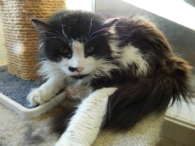 Little Zulu is a wild thing. She’ll hide until she is sure you are OK. This 2-year-old, long-haired black-and-white girl is spayed and good with other cats and dogs.