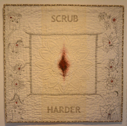 Look closely at the textile art of Amy Meissner and signs of her evolving career emerge. The attention to detail and use of fine fabric show her background in the fashion field. Bold blocks of text reveal a writer’s sensibility. Children’s drawings done in stitching suggest she knows how to tell stories through illustration — and that she’s a mom.
