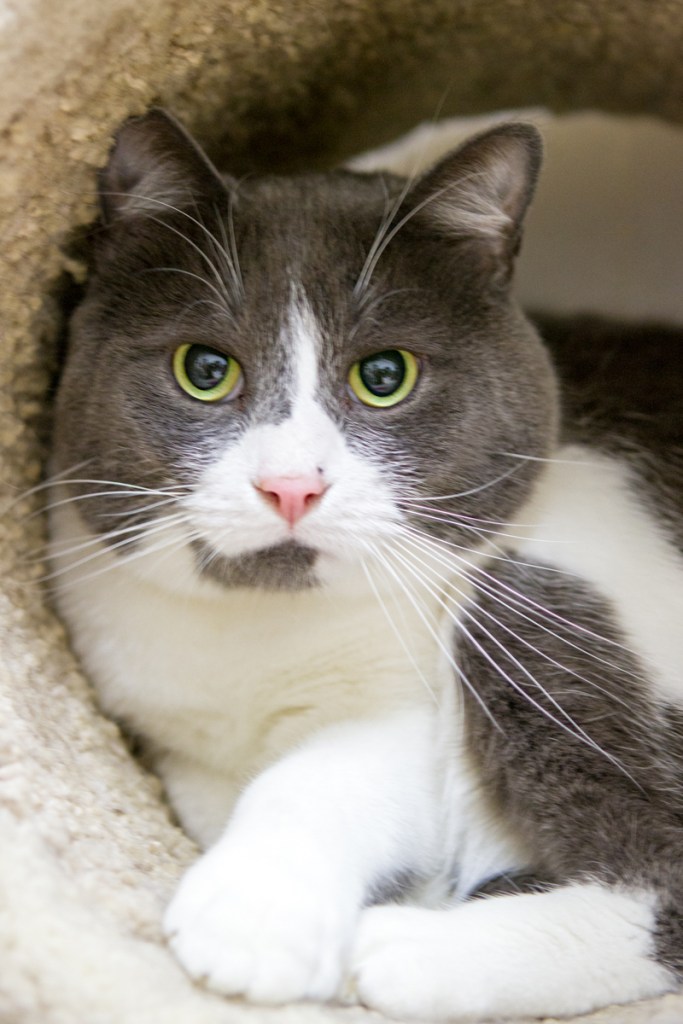 Short on tail (a manx) but long on personality, Val is 5-years-old and absolutely wonderful. This gray-and-white boy is affectionate, good with other cats and oh so handsome. So what the heck are you waiting for?