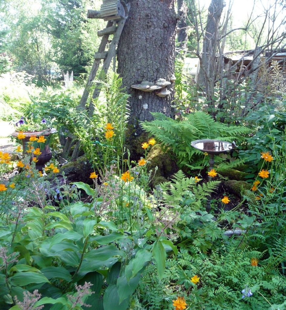 Whimsical metal bird sculptures are tucked into the trees. Look for them as you stroll the forest path. Impressive large beach stones in the border gardens and steps echo the rock solid theme in house siding and entry pillars. Truly trophy hosta flex their mighty leaves under the decks. These gardens are lovely but water steals the show at this tour stop. Natural water burbles, sings and laughs its way from the top of the property to a very large pond below. A wide rocked channel guides the sparkling streamlet under an arched bridge on its way through a peaceful forest of birch, alder, wild rose and fern. The easy winding path leads to a wide curving man-made reflecting pond. This pleasant water feature hosts fish, birds and at least one moose family and adds an eye-catching focal point to the home landscape from many viewing places. Sit on the bench and enjoy the wildlife and wild scape in the ambience of this out-of-the-ordinary retreat.