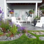 Groves of sun-dappled birch trees frame spectacular views of Kachemak Bay and link lush lawns to a striking perennial border garden. Texture and color created by masterful use of foliage enhances this elegant home and delights the eye. Local stones and sculptural art pieces accent shrubs and herbaceous perennial varieties. Burgundy and purple foliage flaunt rich hues near frilly yellows, scalloped reds and vibrant spiky green leaves in a visual party. Unusual plants like Swedish Aspen combined in innovative designs may inspire the visitor to go home and plant beyond typical and tame. Birds flock to this peaceful setting and its unique feeders and baths. Enjoy the experience.