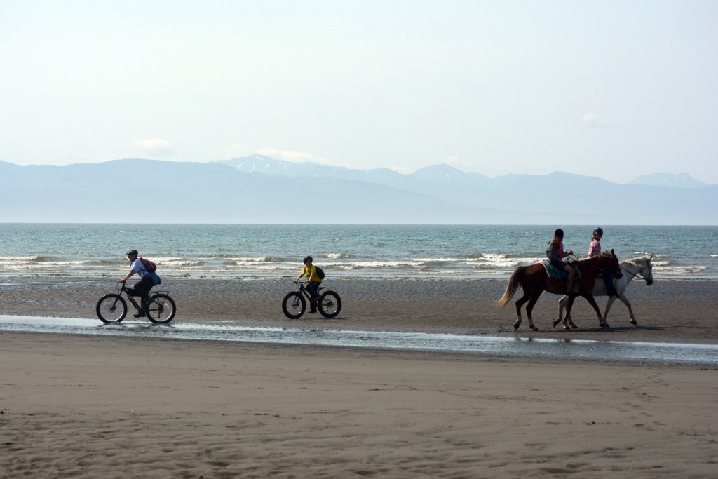 Bicyclists and horse riders pass each other near Mariner Park beach on the Homer Spit in late June. On Monday at its 6 p.m. regular meeting, the Homer City Council will go from placid tidepools to heavy surf when it considers an ordinance regulating motorized vehicle access to Bishop’s Beach and the Homer Spit. Horse riding and bike riding would not be restricted under recommendations by the Parks and Recreation Advisory Commission.-Photo by Michael Armstrong, Homer News
