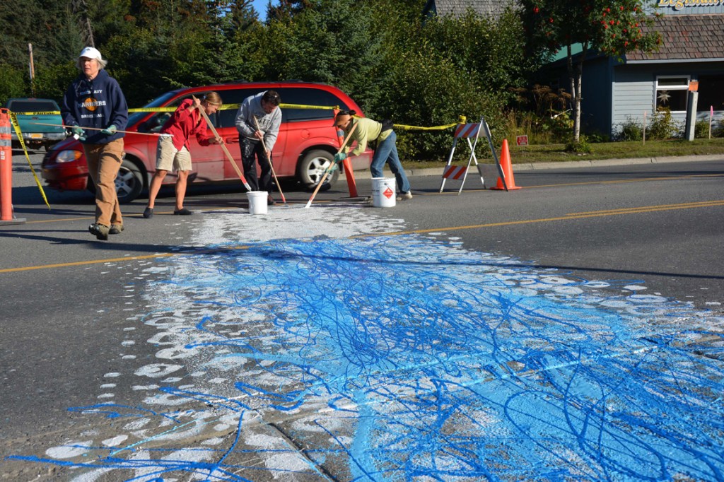 Volunteers with the Woodard Creek Coalition on Sunday paint a swath of blue on Pioneer Avenue near Bartlett Street to show where Woodard Creek passes under the road. The coalition has been working to increase awareness of and protect the creek, with plans to daylight or expose the creek in some areas.