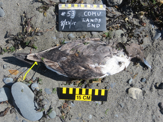 Last Friday, COASST volunteers Carol Harding and Janet Klein reported finding dead 11 common murres, three sooty shearwaters, a glaucous winged gull and a marbled murrelet, all in a 1.7-kilometer stretch on the Spit beach from the mouth of the harbor to the Seafarers Memorial. Harding also said they saw three dying murres struggling in the surf.