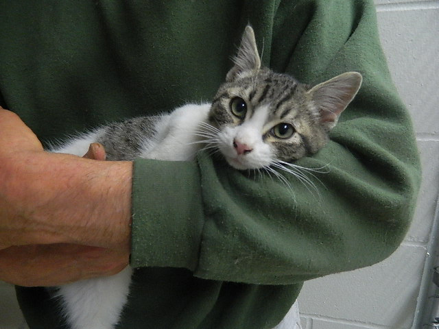 “Are you lonesome tonight?” Well, just come visit little Elvis! This 4-month-old, short hair gray-and-white tabby is a total love bug — and such a handsome devil. You’ll never be lonely again.