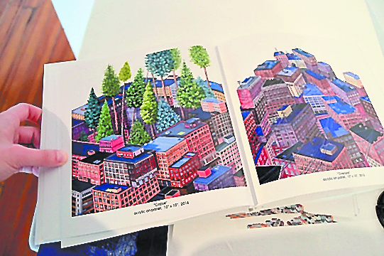 Most of Casey’s work centers around cities. She paints houses tightly packed, in a way residences seldom are in Homer: piled up on each other, winding up into the sky on stilts or hanging down in nets, surrounded by ribbons of roadway, wound together with strings.