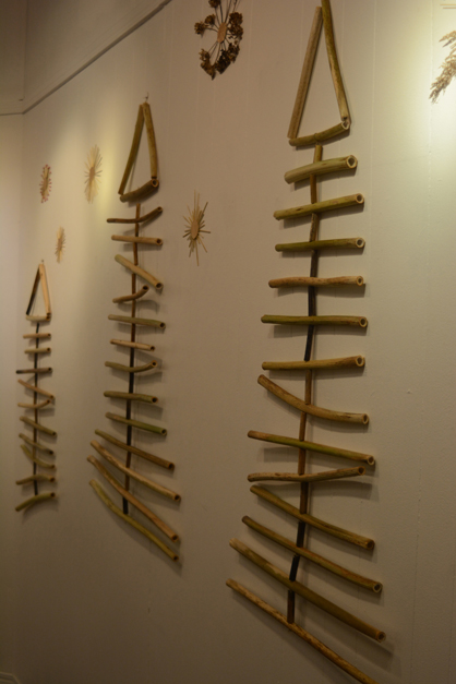 Made of rye grass straw, Puzuri can be as elaborate as the large centerpiece or as simple as a ring of grass stalks. To add a Kachemak Bay touch, Snepste also used kelp, pushki, alder berries and lupine seed pods. A grove of kelp Christmas trees fills one wall. She also made three-dimensional stars. String is threaded through pieces of hollow grass straw and tied together.