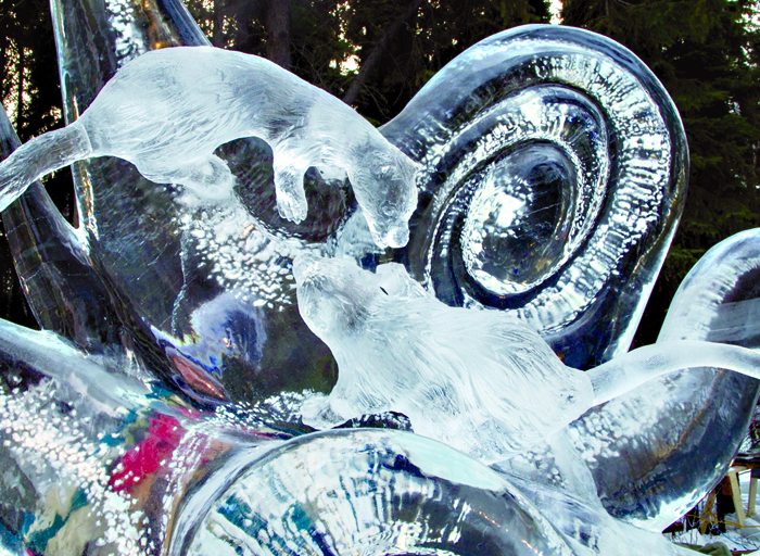 Artists work with a single block of ice that’s 8-feet-by-5-feet-by-3 feet. Ice comes from a pond near the ice carving site. Artists can choose their work site, but take the ice given. Barnabas said their piece was relatively clear with few bubbles. Working temperatures were close to 0 degrees at night and in the mid-20s in the day. On some days the temperature got above freezing, so the artists had to shade the work from the sun. Tyvek house wrap works particularly well since it doesn’t stick to ice, Ben Firth said.