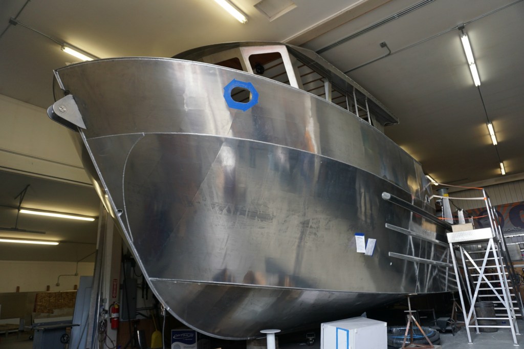 The 50-foot King Island nearly scraped the ceiling while being constructed at Bay Weld Boats in April. The King Island has now been completed and launched. Built as a collaboration with the Homer Marine Trades Association, an open house for Bay Weld’s biggest boat ever is 4 p.m. today at the HH Floats near the new Homer Harbor Office.-Photo by Michael Armstrong, Homer News