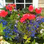 Let’s start with the window box. This is the first hint of a garden, a not-so-subtle clue of what is behind the moose fence. The plan is for the flowers to be a greeter, to welcome friends, to make visitors feel instantly at ease. It contains three tuber begonias, a clutch of pansies, a few lobelia and a little bacopa at the corners. I knew this combination was going to go into that window box before the house was built. Now there’s some planning. Every year its more or less the same. Why not? It works. This is the north side, requiring plants that don’t need a vast amount of sun and most definitely need to be out of the wind (the begonias). The begonia blooms are fully double and upright. This makes for a top heavy plant and if left to its own devices it can topple and break. I caught this just in time and braced them with mini stakes. Some years I fail to take notice, just marveling at the sight of them beaming at me, and not registering that they are on their way over. I also like to pinch out the male blooms. These are the single ones that detract from the double blooms. Once pinched there is more room for the bigger show. The pansies are kept deadheaded so they keep on blooming. Lovely. Pick a spot at your entry where you can compose a lovely combination of plants, preferably in a container. It will brighten your day.