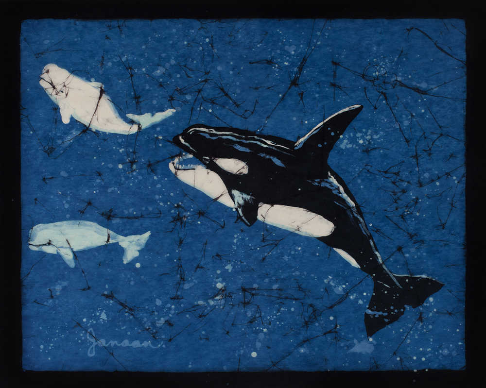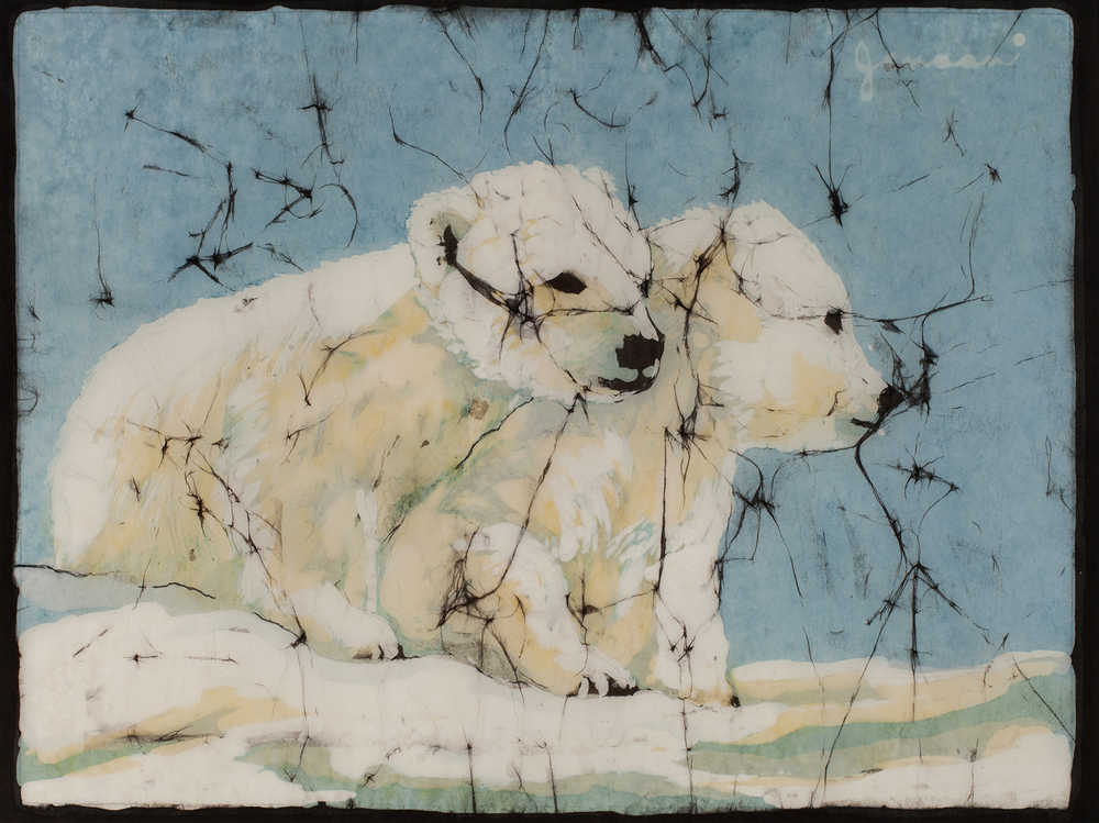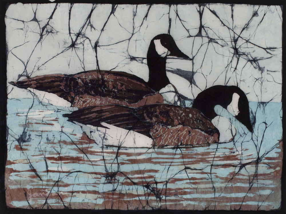 Anchorage artist Janaan Kitchen creates fine-art batiks on rice paper with melted-wax resist and dye. She also creates encaustics for which the melted wax is the color. On finished batiks, all the wax is removed and the colored dyes remain. Her favorite subjects are wildlife and birds. Janaan has done batiks since 1973, and she may be the only artist to work on paper rather than the traditional fabric. Kitchen said that recent health issues may require that she put away her batik tools, and that this could be her last show.